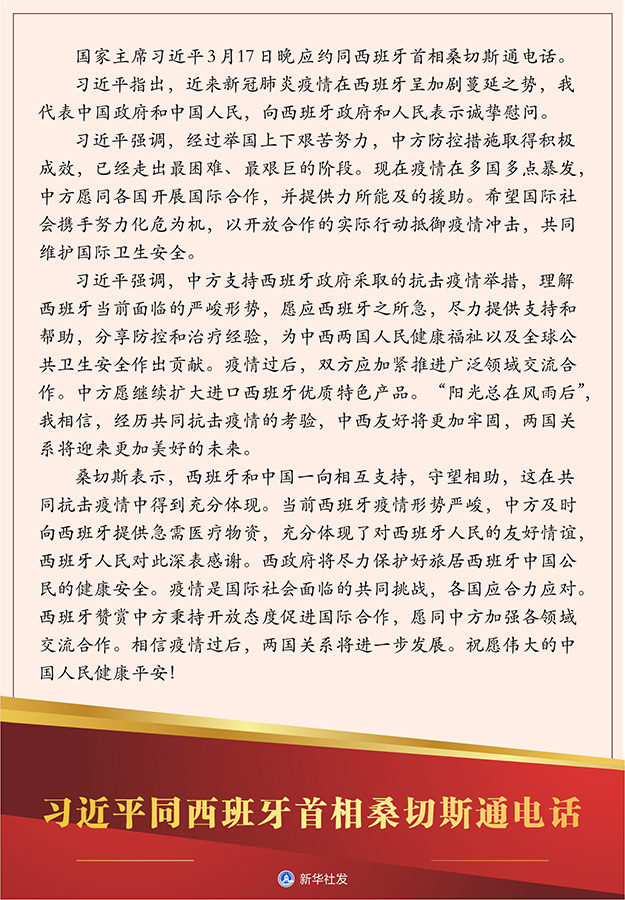 習近平強調,中方支持西班牙政府采取的抗擊疫情舉措,理解西班牙當前面臨的嚴峻形勢,愿應西班牙之所急,盡力提供支持和幫助,分享防控和治療經(jīng)驗,為中西兩國人民健康福祉以及全球公共衛(wèi)生安全作出貢獻。疫情過后,雙方應加緊推進廣泛領域交流合作。中方愿繼續(xù)擴大進口西班牙優(yōu)質特色產(chǎn)品!瓣柟饪傇陲L雨后”,我相信,經(jīng)歷共同抗擊疫情的考驗,中西友好將更加牢固,兩國關系將迎來更加美好的未來。