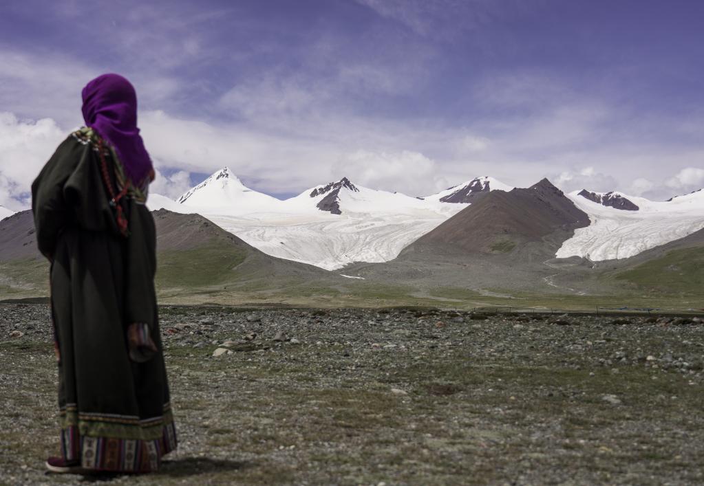 2020年8月15日,在青海省玉樹藏族自治州,牧民在雪山腳下遠眺崗加曲巴冰川。新華社記者吳剛攝