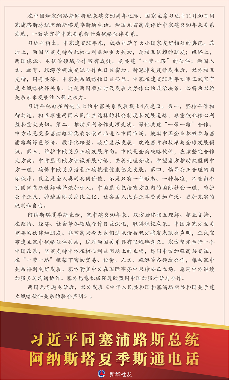 新華社北京11月30日電 在中國(guó)和塞浦路斯即將迎來(lái)建交50周年之際,國(guó)家主席習(xí)近平11月30日同塞浦路斯總統(tǒng)阿納斯塔夏季斯通電話。兩國(guó)元首高度評(píng)價(jià)中塞建交50年來(lái)關(guān)系發(fā)展,一致決定將中塞關(guān)系提升為戰(zhàn)略伙伴關(guān)系。