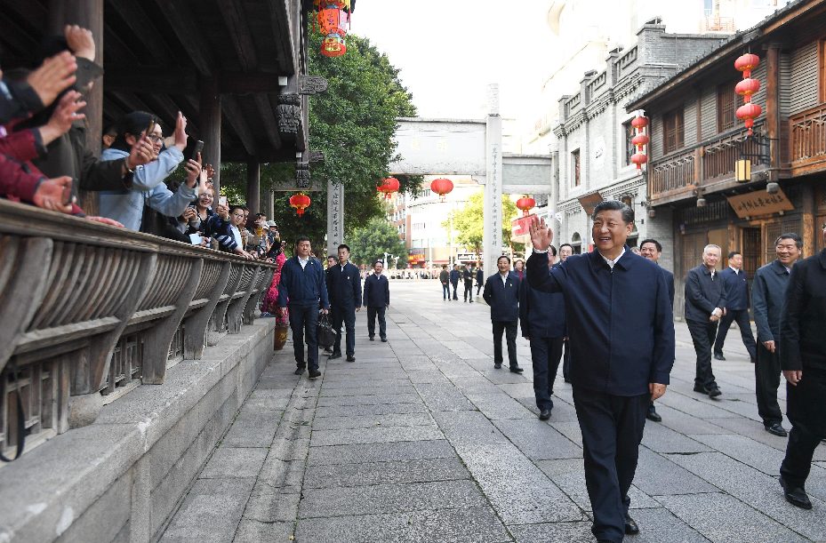 △2021年3月24日下午,中共中央總書記、國家主席、中央軍委主席習近平在福州三坊七巷歷史文化街區(qū)考察時,向游客和市民招手致意。