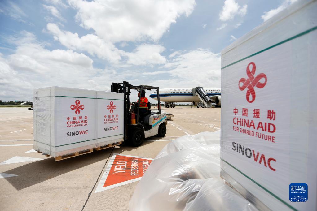 2021年10月14日,工作人員在柬埔寨金邊國際機場運輸中國政府援助柬埔寨的科興新冠疫苗。新華社發(fā)(批隆攝)