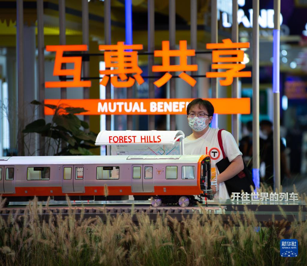 2021年9月4日,在位于北京的國家會議中心中國服務(wù)貿(mào)易發(fā)展成就展上,觀眾參觀中國軌道交通出口裝備模型。新華社記者 陳鐘昊 攝