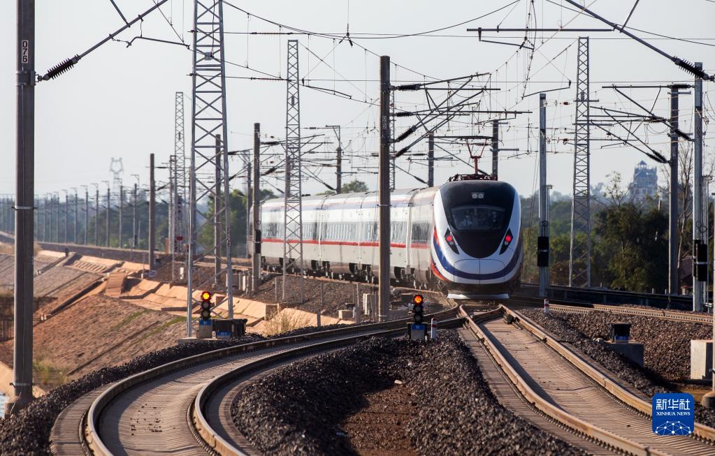 2021年12月3日,“瀾滄號”動車組列車駛離老撾萬象站。當(dāng)日,中國昆明站內(nèi)的復(fù)興號“綠巨人”、老撾萬象站內(nèi)的“瀾滄號”動車組列車緩緩開動,開啟一段跨越山河、相互奔赴的旅程。這標(biāo)志著連接昆明和萬象、采用中國標(biāo)準(zhǔn)的中老鐵路全線開通運營。新華社發(fā)(凱喬攝)