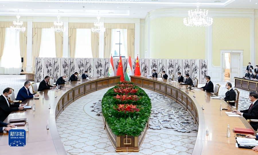 當(dāng)?shù)貢r(shí)間9月15日上午,國家主席習(xí)近平在撒馬爾罕國賓館會(huì)見塔吉克斯坦總統(tǒng)拉赫蒙。新華社記者 鞠鵬 攝