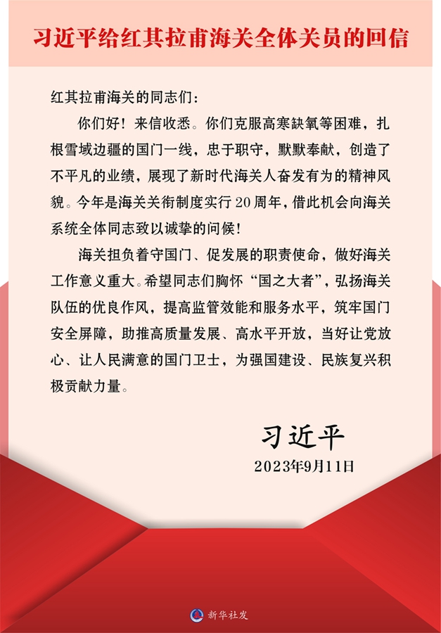 新華社北京9月12日電 中共中央總書記、國(guó)家主席、中央軍委主席習(xí)近平9月11日給紅其拉甫海關(guān)全體關(guān)員回信,對(duì)海關(guān)系統(tǒng)干部職工更好履行職責(zé)使命提出殷切期望。