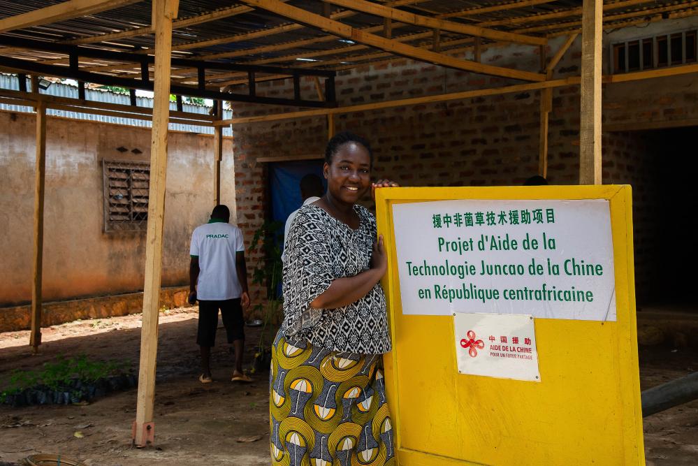 2022年5月31日,在中非共和國首都班吉郊區(qū),一名當地婦女站在中國援中非菌草技術項目展板旁。(新華社記者羅毓攝)