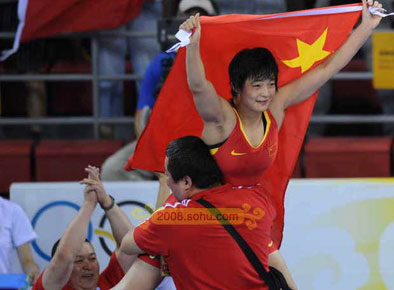 奪冠之后,王嬌顯得非常激動,她上前擁抱了站在場邊的教練;現(xiàn)場觀眾則顯得非常興奮!王嬌笑到了最后,這是中國摔跤隊在本屆奧運會贏得的首枚金牌,同時這也是中國代表團(tuán)在北京奧運會奪取的第30枚金牌!王嬌賽后第一時間拿著五星紅旗繞場一周,中國農(nóng)業(yè)大學(xué)體育館沸騰了。ㄋ押w育 可樂)