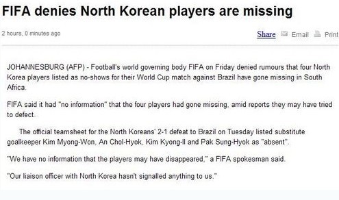 “此前一些媒體上出現(xiàn)所謂朝鮮球員沒有出現(xiàn)在報(bào)名名單并且在南非失蹤的消息純屬謠傳,是子虛烏有。朝鮮隊(duì)已經(jīng)早今天早上否認(rèn)了這些謠言,并且稱目前朝鮮隊(duì)正在積極備戰(zhàn)第二場比賽,球隊(duì)目前一切狀況良好!眹H足聯(lián)官員Nicolas Maingot表示。