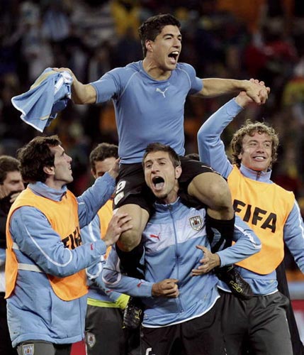 南非當(dāng)?shù)貢r(shí)間2日晚上的一場1/4決賽,烏拉圭與加納120分鐘內(nèi)戰(zhàn)成1-1平。那場比賽進(jìn)行至加時(shí)賽下半段補(bǔ)時(shí)階段,蘇亞雷斯用手擋住了加納必進(jìn)球機(jī)會(huì),當(dāng)值主裁隨即將這名烏拉圭前鋒紅牌罰下,并且判給加納隊(duì)一粒點(diǎn)球。但是,加納主罰點(diǎn)球球員吉安并沒有抵得住壓力,點(diǎn)球擊中橫梁,最終比賽進(jìn)入殘酷的點(diǎn)球大戰(zhàn),烏拉圭憑借著門將穆斯萊拉的神奇發(fā)揮,總比分5-3戰(zhàn)勝加納晉級(jí)四強(qiáng)。