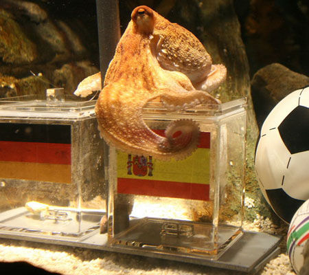 之后,水族館工作人員會換上貼有西班牙和荷蘭國旗的玻璃箱,讓保羅預(yù)測周日的決賽賽果。不過,要想保羅出手預(yù)測決賽并沒有100%的保證,那需要它的八只觸角沒有過度疲勞,而且還要這只神奇軟體動(dòng)物仍然饑餓,有意覓食方可。