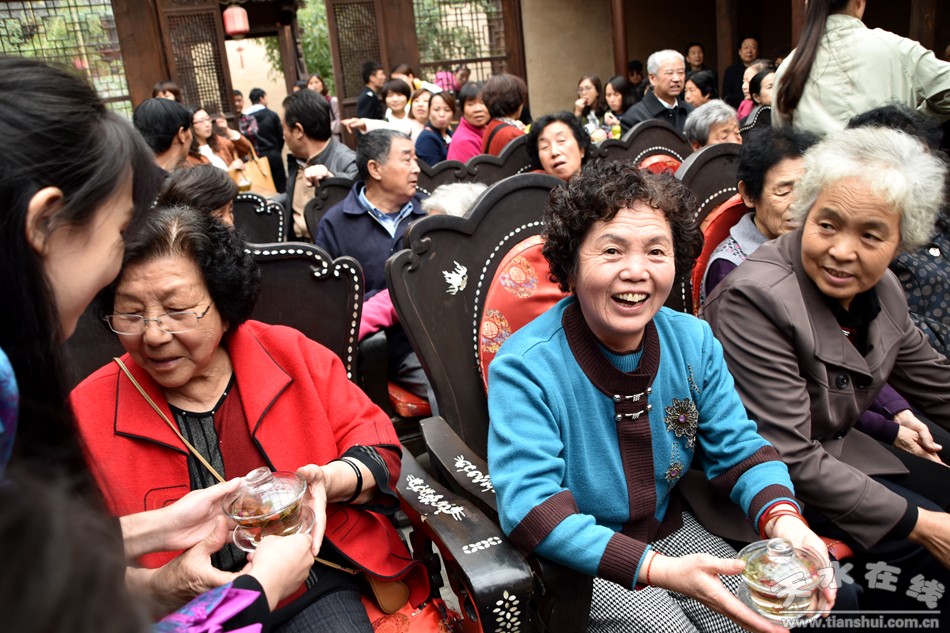 本次活動由天水民俗博物館主辦,秦州區(qū)大城街道辦事處、天水市楹聯(lián)學(xué)會協(xié)辦。來自大城街道社區(qū)的30位60歲以上的老人參加了此次活動。當(dāng)日,參加活動的老人在講解員的帶領(lǐng)下參觀了天水市民俗博物館,在戲苑觀看了秦腔戲劇表演。在觀看表演的過程中,他們有的輕聲吟唱,有的跟著演員的表演敲打著節(jié)拍,有的干脆趁表演的空隙直接上臺清唱亮嗓,老人們完全沉醉在戲曲的世界里;工作人員為每位老人貼心準備了茶點,表達對老人的關(guān)愛之情;更有天水市楹聯(lián)學(xué)會的書畫家們,現(xiàn)場為老人們創(chuàng)作書畫作品,并贈與老人向他們表達祝福,一幅幅散發(fā)墨香的翰墨丹青,讓老人們愛不釋手;顒蝇F(xiàn)場氣氛活躍,老人們個個情緒高漲,對能夠來參加活動感到很高興,也對此次活動的組織贊不絕口。