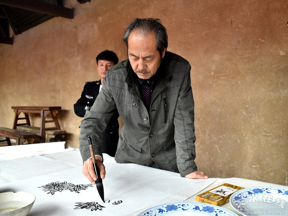 (天水市楹聯(lián)學(xué)會的書畫家們,現(xiàn)場為老人們創(chuàng)作書畫作品。)