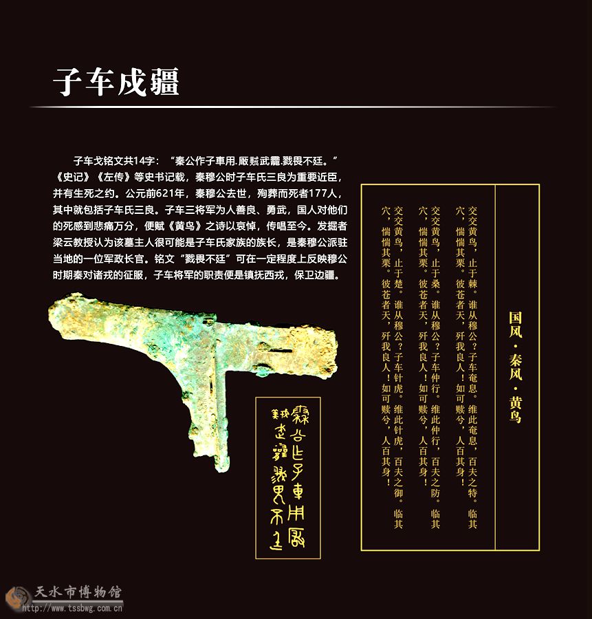 這次展覽共設(shè)置四個(gè)單元,以天水地區(qū)甘谷毛家坪遺址、清水李崖遺址、張家川馬家塬遺址考古發(fā)掘出土文物為主,展品年代從西周中期延續(xù)至戰(zhàn)國晚期。第一單元以甘谷毛家坪遺址上世紀(jì)80年代和本世紀(jì)發(fā)掘的陶器以及2010—2011年清水李崖遺址發(fā)掘的陶器為主,展示目前發(fā)現(xiàn)的最早的嬴秦文化遺存;第二單元展示禮縣大堡子山、甘谷毛家坪遺址出土青銅容器、兵器和陶器,其中毛家坪遺址出土的“子車戈”是與《史記》《左傳》等文獻(xiàn)所記載的“子車氏”信息相關(guān)的實(shí)物遺存;第三單元展示張家川馬家塬遺址、秦安王洼墓地出土的金、銀、銅等身體裝飾、車飾及其他重要遺物,呈現(xiàn)戰(zhàn)國晚期西戎貴族奢華的葬俗以及多元文化融合。第四單元集中介紹早期秦文化項(xiàng)目取得的考古成果以及做出貢獻(xiàn)的考古學(xué)家。