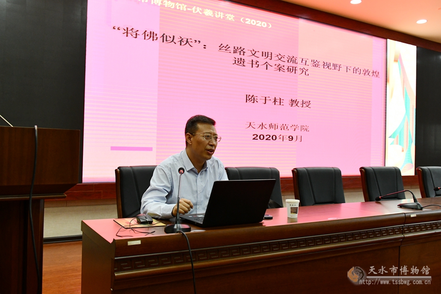 9月9日下午,天水市博物館、伏羲學(xué)院特邀天水師范學(xué)院歷史文化學(xué)院院長、教授陳于柱來我館作題為《“將佛似祆”:絲路文明交流互鑒視野下的敦煌遺書個案研究》的專題講座。講座由天水市博物館館長、伏羲學(xué)院院長李寧民主持。博物館干部職工、天水師范學(xué)院師生及對歷史文化和敦煌學(xué)感興趣的社會各界人士100余人聆聽講座。