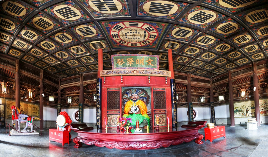 天水伏羲廟整體建筑坐北朝南,四進(jìn)六院,具有典型的中國(guó)古代宮廷式建筑格局。主體建筑先天殿內(nèi)現(xiàn)存明代伏羲泥塑彩繪巨像一尊,身高3米,手托先天八卦太極盤,威儀古樸,彰顯先祖王者的高大形象。