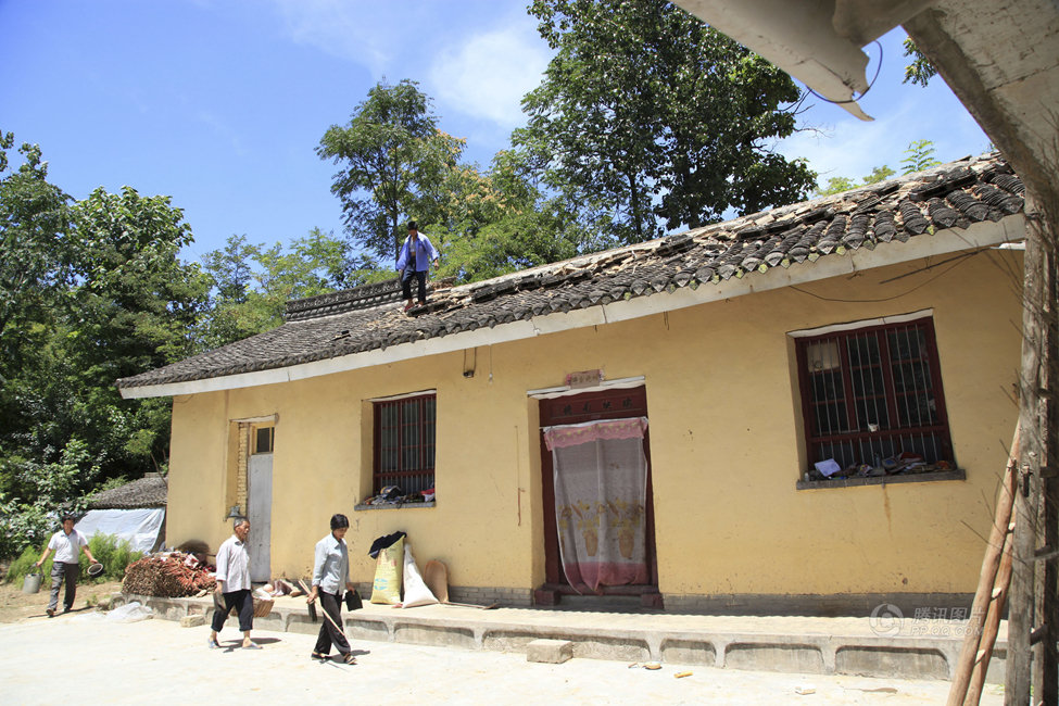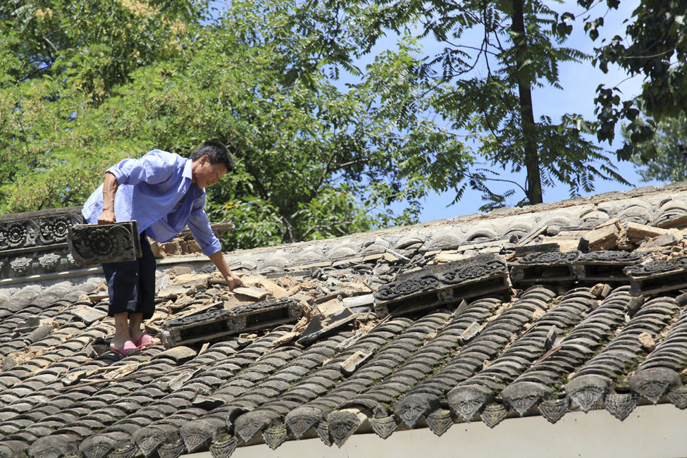 7月22日,甘肅省隴南市成縣城關(guān)鎮(zhèn)北山村村民在清理受損的房脊碎片。新華社發(fā)(吳庭棟 攝)