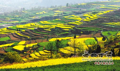 四月的隴南,是花的海洋。滿山遍野的杏花、桃花、梨花、櫻桃花在春風(fēng)的撫慰下恣意綻放。大片的油菜花,在翠綠的麥田襯托下顯得鮮嫩金黃!皾M山遍野黃金甲”的別致風(fēng)景讓人駐足,隨風(fēng)而至的陣陣花香使人陶醉。