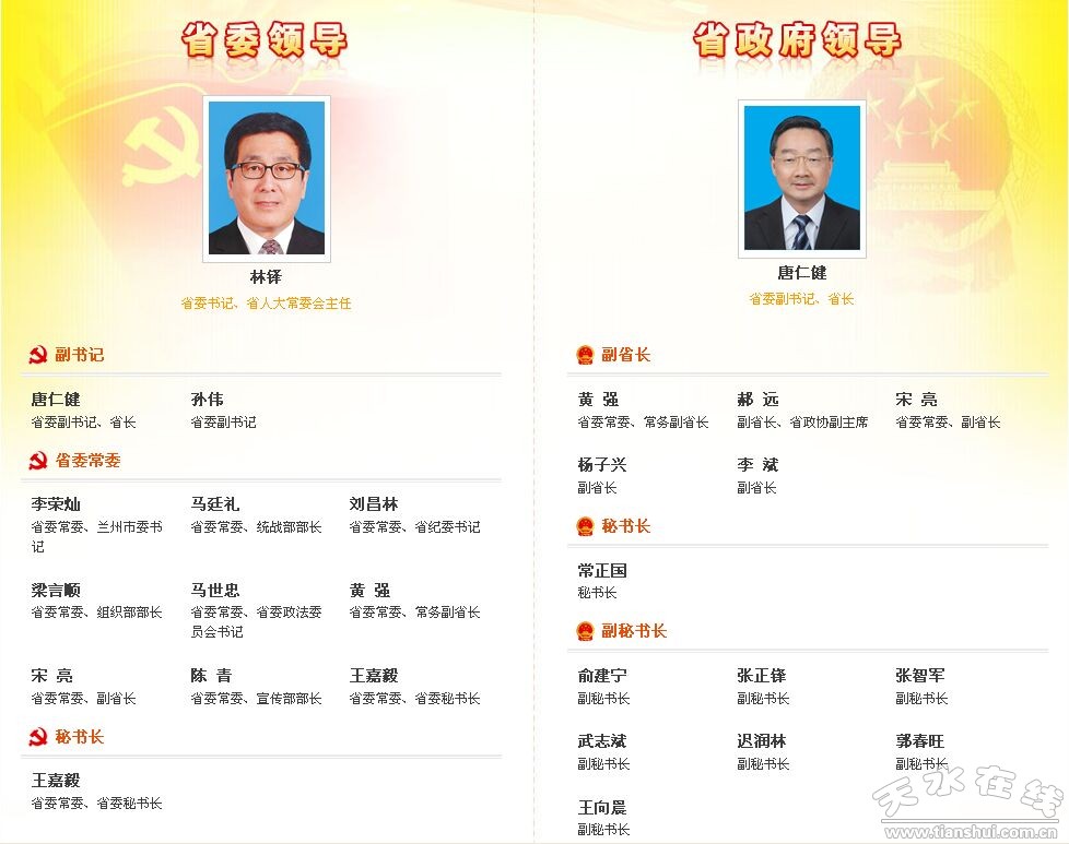 目前,甘肅省委常委班子共有12人,除了馬廷禮(省委統(tǒng)戰(zhàn)部部長)在換屆后由寧夏轉(zhuǎn)崗?fù),其?1人分別是:林鐸(省委書記)、唐仁。ㄊ∥睍、省長)、孫偉(省委副書記)、李榮燦(蘭州市委書記)、劉昌林(省紀(jì)委書記)、梁言順(省委組織部部長)、馬世忠(省委政法委書記、省公安廳廳長)、黃強(qiáng)(常務(wù)副省長)、宋亮(副省長)、陳青(省委宣傳部部長)、王嘉毅(省委秘書長)。