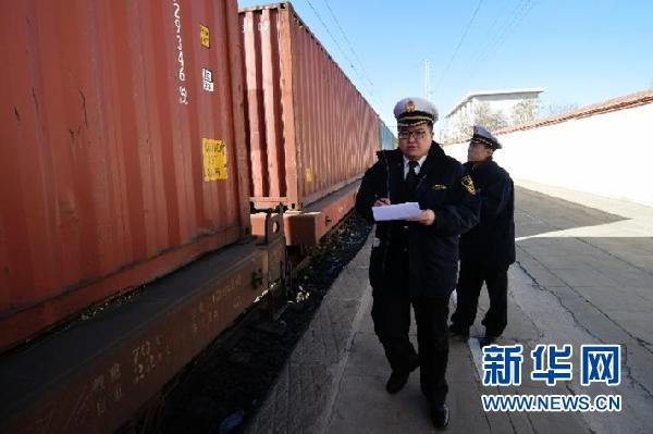 兩名海關(guān)工作人員在“天馬號(hào)”開(kāi)車(chē)前檢查登記。(資料圖)新華社記者 陳斌 攝