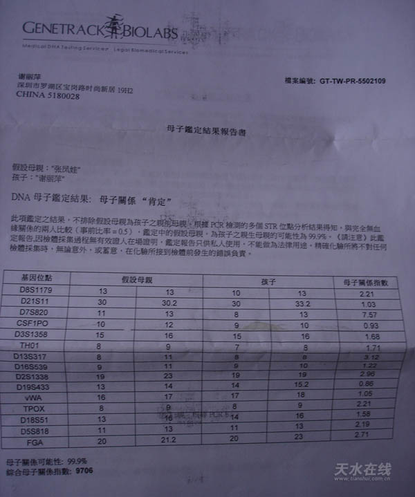 謝健中1971年出生,兩歲時其母張鳳娃離家出走,現(xiàn)在陜西省周至縣四童鄉(xiāng)聯(lián)二村。張鳳娃說,謝麗萍乳名叫芳玲,生日是1970年1月22日。母女初次見面時,因張鳳娃不能提供更多的證據(jù)證明謝麗萍就是她失散多年的女兒,最后雙方?jīng)Q定做親子鑒定。7月13日,親子鑒定基因比對結(jié)論出來了:張鳳娃是謝麗萍的生身母親。