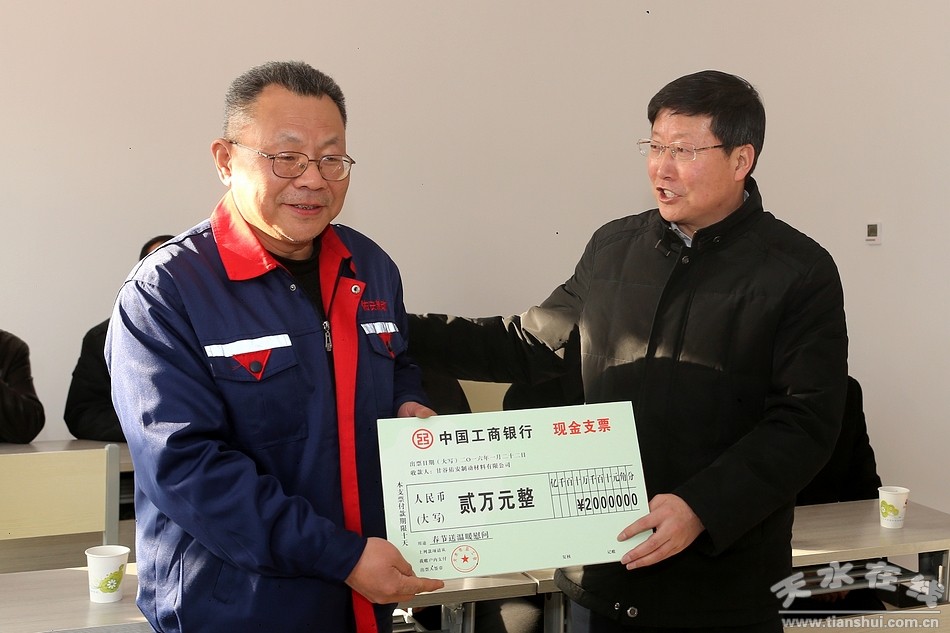 問候情意濃,祝福暖民心。在春節(jié)即將來臨之際,1月26日下午,天水市委副書記、市政協(xié)主席宋尚有,市委常委、政法委書記趙衛(wèi)東,市人大常委會副主任蕭菡,副市長王鈞,市政協(xié)副主席安志宏,市政協(xié)秘書長劉永年帶領(lǐng)市委組織部、市民政局、市衛(wèi)計委、市殘聯(lián)、市總工會、市政府外事僑辦等部門負責人一行深入甘谷縣,開展“送溫暖”慰問活動!