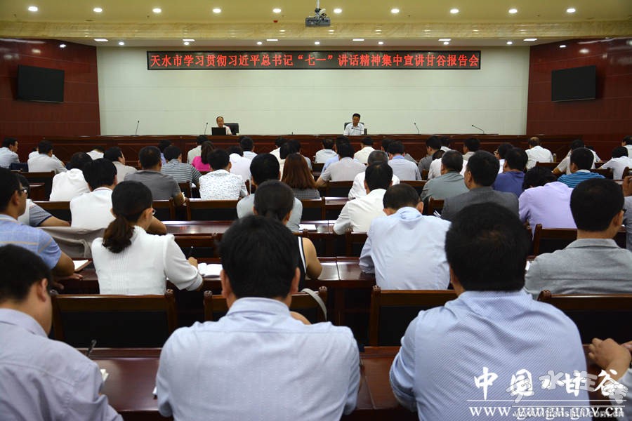 9月1日,天水市委講師團(tuán)團(tuán)長郭黎平帶領(lǐng)宣講團(tuán)深入甘谷宣講習(xí)近平總書記“七一”重要講話精神。縣四大組織在家領(lǐng)導(dǎo),各鄉(xiāng)鎮(zhèn)、各部門、各單位科級以上領(lǐng)導(dǎo)干部共計320多人在主會場聆聽了輔導(dǎo)報告?h委常委、宣傳部長張慶元主持報告會。