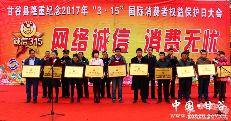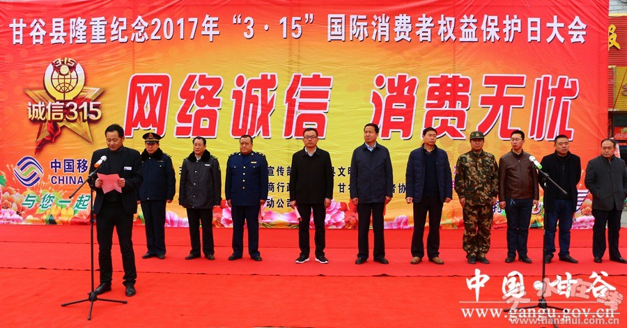3月15日,甘谷縣舉辦“網(wǎng)絡(luò)誠(chéng)信 消費(fèi)無憂”消費(fèi)者權(quán)益保護(hù)日活動(dòng)?h委常委、宣傳部長(zhǎng)張慶元,縣人大常委會(huì)副主任劉永仁,副縣長(zhǎng)郭小鵬出席活動(dòng);縣“3•15”活動(dòng)協(xié)調(diào)領(lǐng)導(dǎo)小組成員單位負(fù)責(zé)人、干部職工及部分企業(yè)代表共計(jì)400多人參加活動(dòng)。
