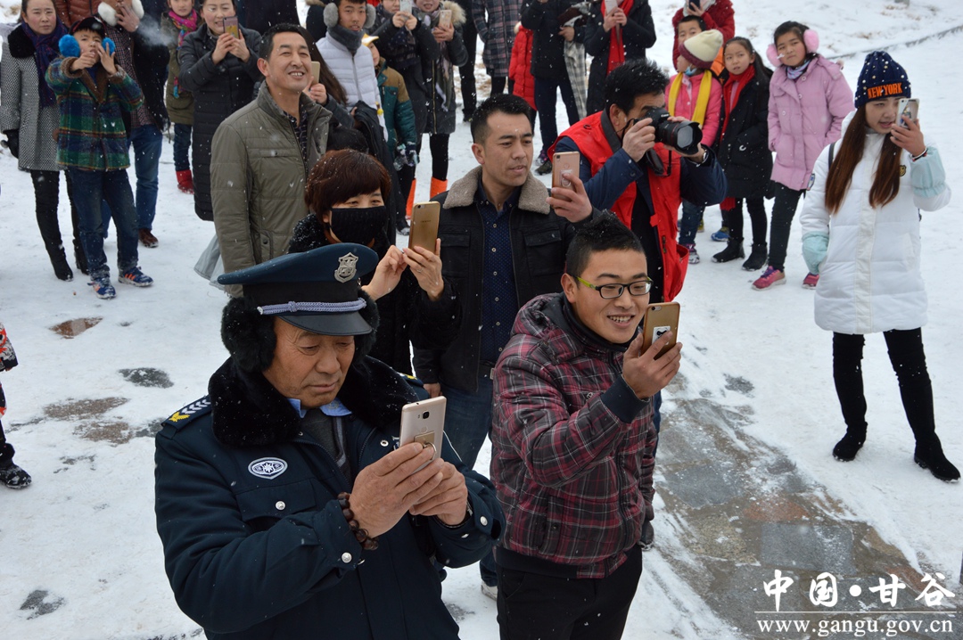 仰望雪中的大像山,猶如天然的畫師經(jīng)神來之筆點綴,一幅絕世的水墨佳作應(yīng)雪而生,大氣磅礴,超凡脫俗。山下公園內(nèi),人們紛紛踏雪而來,孩子們興奮地打起雪仗、堆起雪人,女人們身穿節(jié)日的盛裝,擺起不同的姿勢,用手機拍照留下歡快的紀(jì)念。還有那一個個手拿相機的攝影愛好者,他們時而蹲、時而舉,靈敏矯健,表情豐富,癡迷在大自然的藝術(shù)杰作里而忘記嚴(yán)寒。