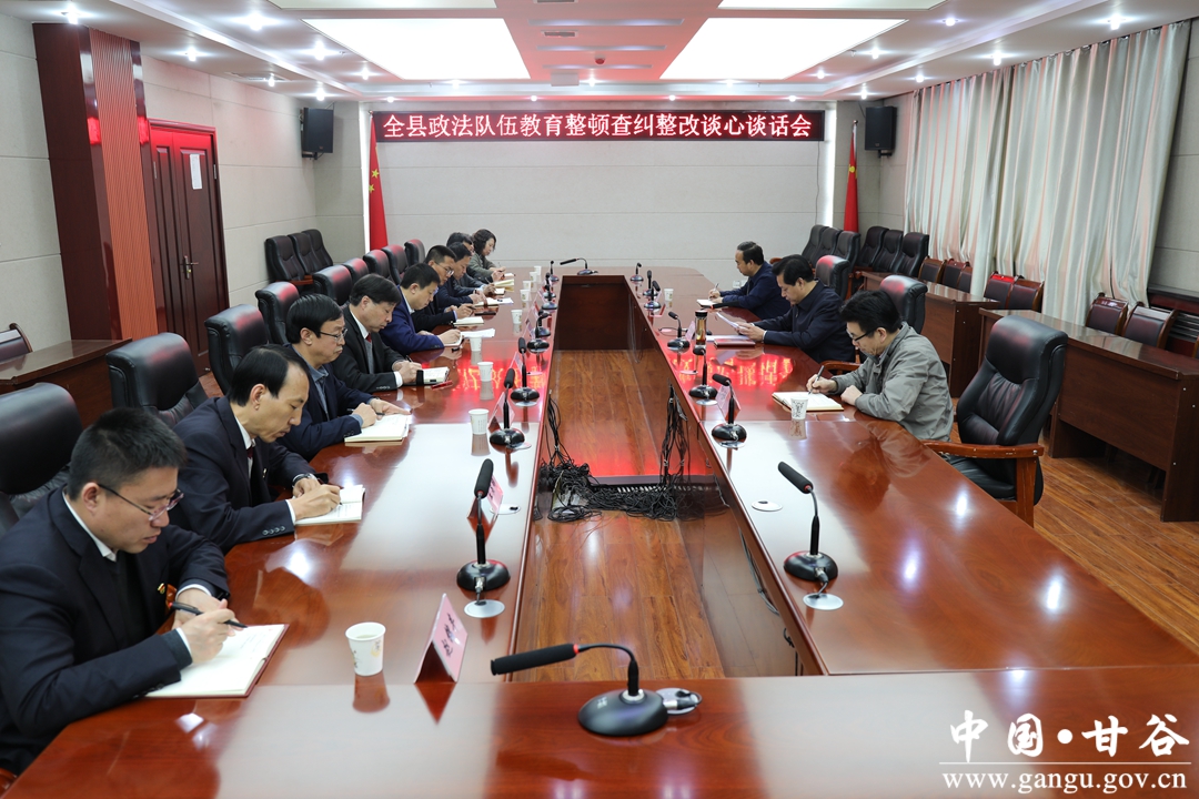 4月26日,市人大常委會副主任、甘谷縣委書記、縣政法隊伍教育整頓領(lǐng)導(dǎo)小組組長申君明主持召開甘谷縣政法隊伍教育整頓查糾整改談心談話會議?h委常委、政法委書記、縣政法隊伍教育整頓領(lǐng)導(dǎo)小組常務(wù)副組長馬福勝,副縣長、縣公安局局長、縣政法隊伍教育整頓領(lǐng)導(dǎo)小組副組長張濤,縣法院院長、縣政法隊伍教育整頓領(lǐng)導(dǎo)小組副組長王建軍,縣檢察院檢察長、縣政法隊伍教育整頓領(lǐng)導(dǎo)小組副組長姜云,縣司法局主要負責(zé)人和政法各單位常務(wù)副職參加談心談話。