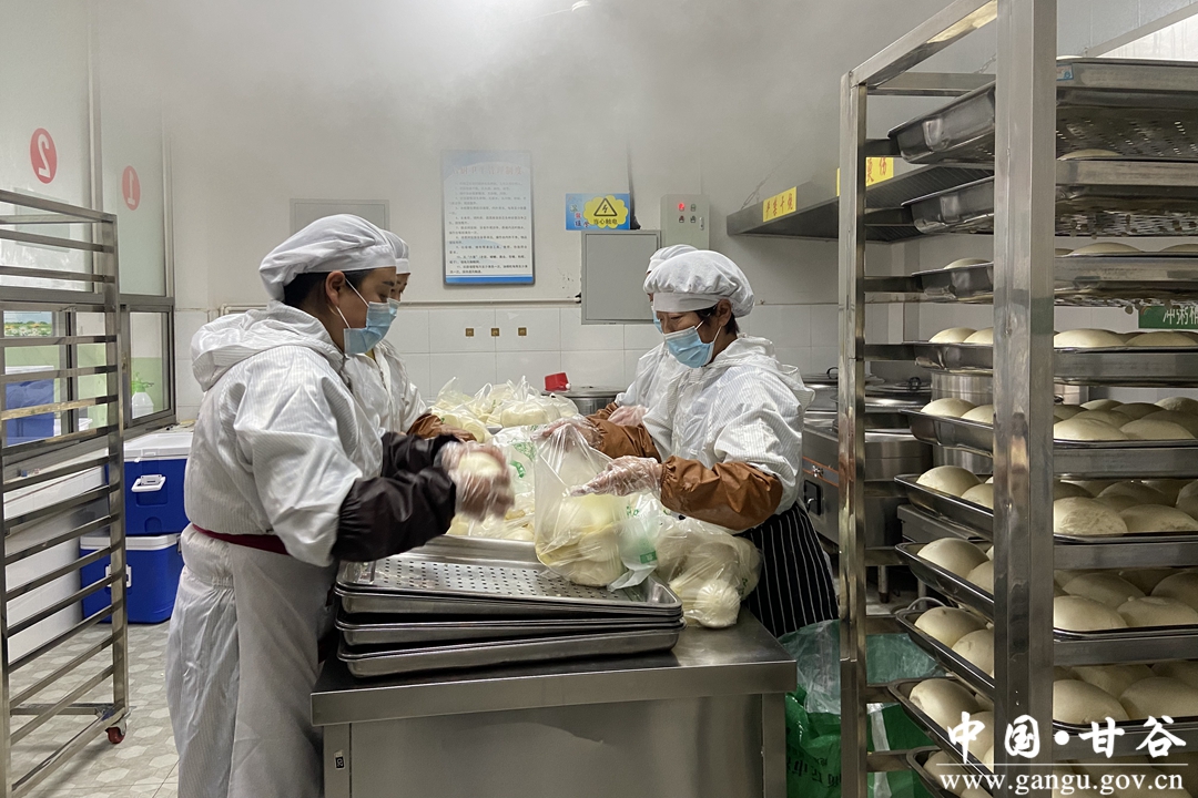 在甘谷縣博優(yōu)餐飲中央廚房有限公司的生產(chǎn)車間里,工作人員正忙著包裝饅頭、榨菜等愛(ài)心物資,這些東西將第一時(shí)間送往城區(qū)各個(gè)疫情防控點(diǎn)。