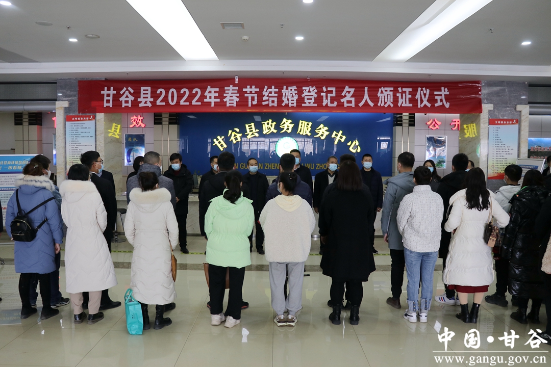 2月14日,甘谷縣婚姻登記處迎來(lái)結(jié)婚登記高峰。值此高峰期,甘谷縣舉辦了2022年春節(jié)結(jié)婚登記頒證儀式。在頒證儀式上,10余對(duì)新人喜結(jié)連理。