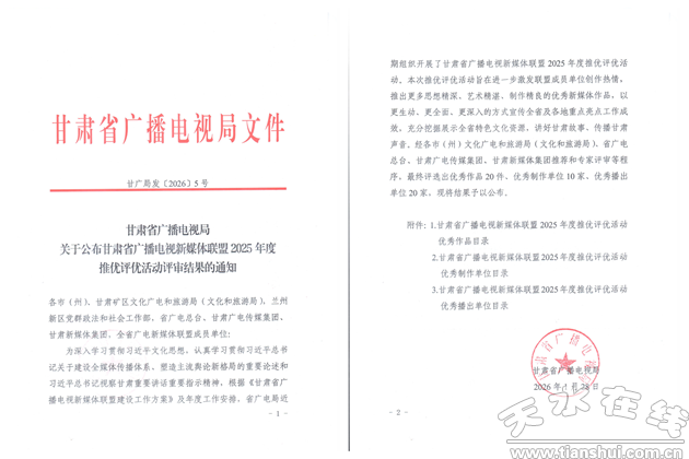 新甘谷訊【記者頡定武】近日,甘肅省廣播電視局正式公布甘肅省廣播電視新媒體聯(lián)盟2025年度推優(yōu)評優(yōu)活動評審結果,甘谷縣融媒體中心憑借扎實的工作成效、優(yōu)質的傳播內容和創(chuàng)新的運營模式,成功斬獲“優(yōu)秀播出單位”榮譽稱號,這是省廣電局及新媒體聯(lián)盟對該中心2025年度新媒體傳播工作的高度肯定與有力褒獎。