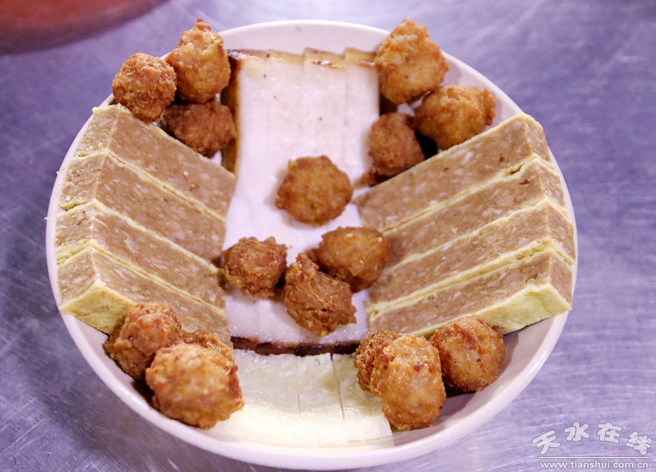 天水扣菜品種之多和制作工序一樣豐富,大約要有二十余種,包括有雜燴、八寶飯、紅燒肉、黃花肉,有糟肉、粉蒸肉、蝦醬肉、梅菜扣肉,黃燜雞、黃燜排骨、黃燜肘子等,也有紅燒肉、紅燒排骨、紅燒帶魚。食材豐富,用料講究,葷素搭配,辣甜適口,傳承至今,滿足了許多天水老少的味蕾。