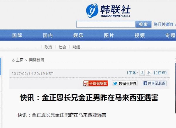 據(jù)韓聯(lián)社消息,金正恩長兄金正男昨在馬來西亞遇害。