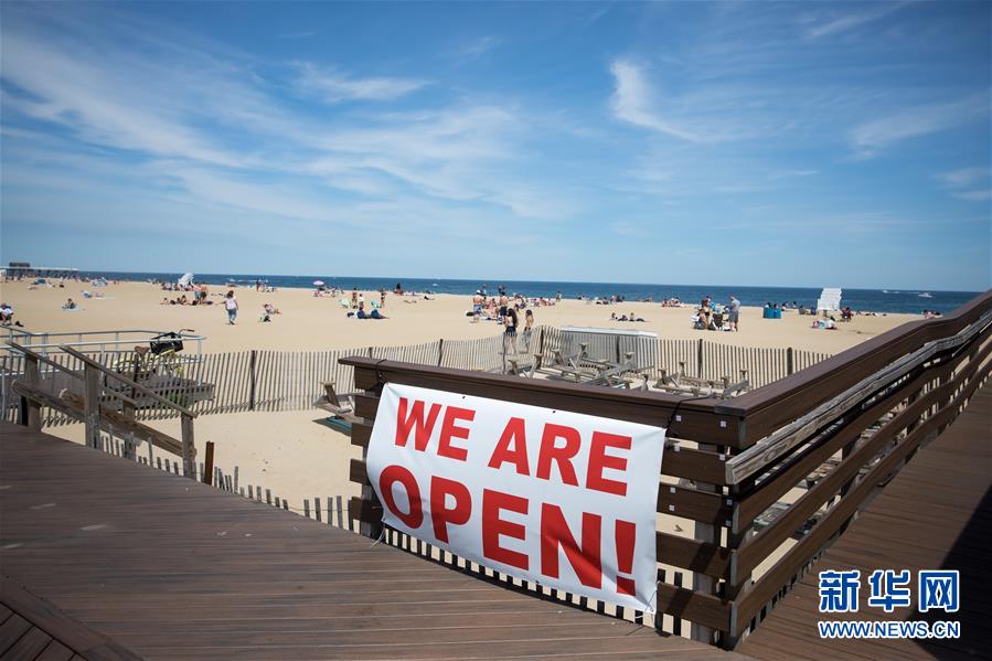 5月16日,人們?cè)诿绹?guó)新澤西州貝爾馬海灘享受陽(yáng)光,一家餐廳打出“營(yíng)業(yè)中”的招牌。 新華社發(fā)(郭克攝)