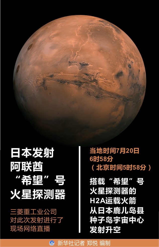 三菱重工業(yè)公司對此次發(fā)射進(jìn)行了現(xiàn)場網(wǎng)絡(luò)直播。當(dāng)?shù)貢r間20日6時58分(北京時間5時58分),一枚H2A運載火箭從日本鹿兒島縣種子島宇宙中心發(fā)射升空,成功將“希望”號火星探測器送入太空。探測器在發(fā)射后約1小時與火箭分離。