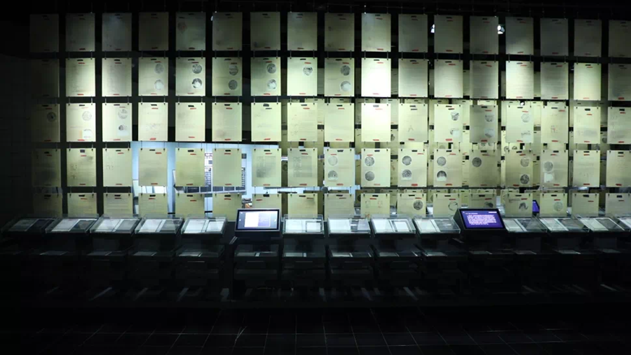 侵華日軍第七三一部隊(duì)罪證陳列館人體實(shí)驗(yàn)展區(qū),一張張英文人體實(shí)驗(yàn)報(bào)告書復(fù)印件,連成一面墻。新華社記者 何山 攝