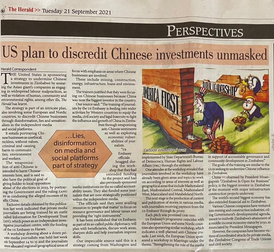 津巴布韋第一大報《先驅(qū)報》9月21日報道說,9月14日至15日,一個名為“信息促進(jìn)發(fā)展信托基金”的機(jī)構(gòu)邀請津巴布韋和周邊國家的12名私營媒體記者參加研討會。會議期間,該機(jī)構(gòu)對這些記者進(jìn)行培訓(xùn),并要求他們瞄準(zhǔn)采礦業(yè)、建筑業(yè)、能源業(yè)、基礎(chǔ)設(shè)施建設(shè)等中資企業(yè)涉足較多的領(lǐng)域,重點(diǎn)關(guān)注中資企業(yè)的“問題”,如違反勞動法、破壞環(huán)境、與當(dāng)?shù)厝藳_突等議題,并予以報道。該活動得到美國駐津使館贊助。