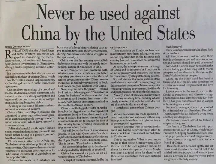 文章認(rèn)為,公平正義沒有價格標(biāo)簽,公平正義不需要用金錢收買。津人民應(yīng)該擦亮雙眼,分清敵友,警惕被美國利用成為反華棋子。中國是進(jìn)步的力量,堅(jiān)定發(fā)展津中友誼與合作,是津巴布韋走向光明未來的正道。
