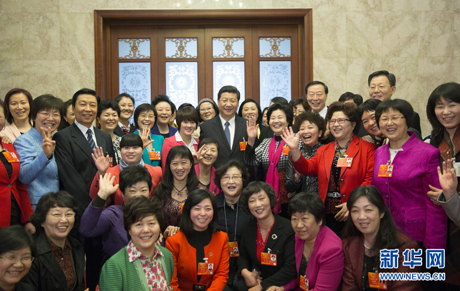 3月8日,中共中央總書記、中共中央軍委主席習近平參加十二屆全國人大一次會議江蘇代表團審議。這是習近平同女代表合影,并代表黨中央向出席兩會的女代表、女委員,向全國各族各界婦女致以節(jié)日的祝賀。新華社記者蘭紅光攝