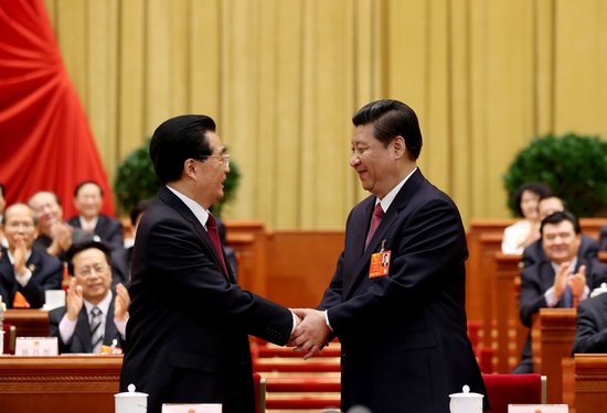 全場(chǎng)熱烈的掌聲中,任期屆滿的十一屆全國(guó)人大常委會(huì)委員長(zhǎng)吳邦國(guó)與張德江親切握手。
