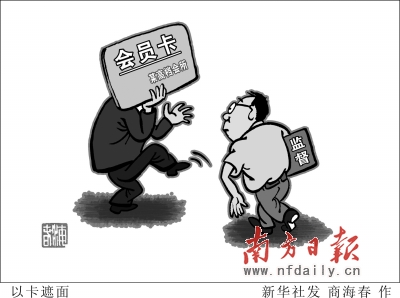 近年來,一些政府官員以“會員”身份出入包括餐飲、休閑娛樂和私人會所在內(nèi)的高檔消費場所,相對隱秘地進行奢侈消費,已經(jīng)顯現(xiàn)出了一種新型的“會員卡腐敗”。(南方日報記者 戎飛騰 陳晨 實習生 湯蓉)