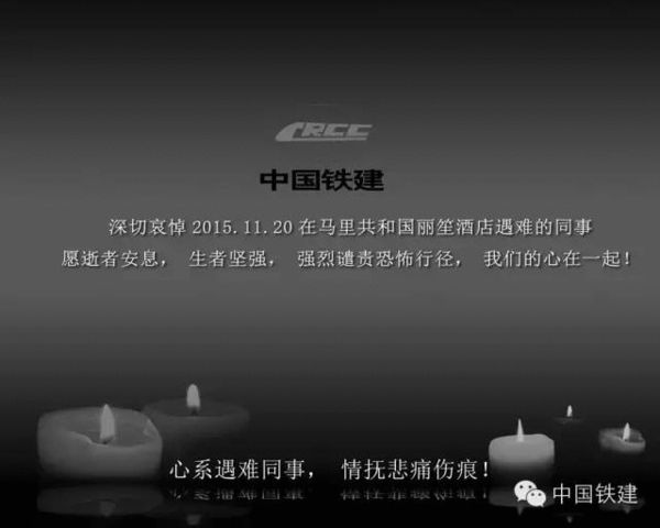 11月21日凌晨2時31分,從中國駐馬里大使館處確認,我公司赴馬里交通部洽談合作項目的三名員工在馬里巴馬科麗笙酒店襲擊事件中不幸遇難。三名員工分別是:中國鐵建國際集團總經理周天想,中國鐵建國際集團副總經理王選尚,中國鐵建國際集團西非公司總經理常學輝。