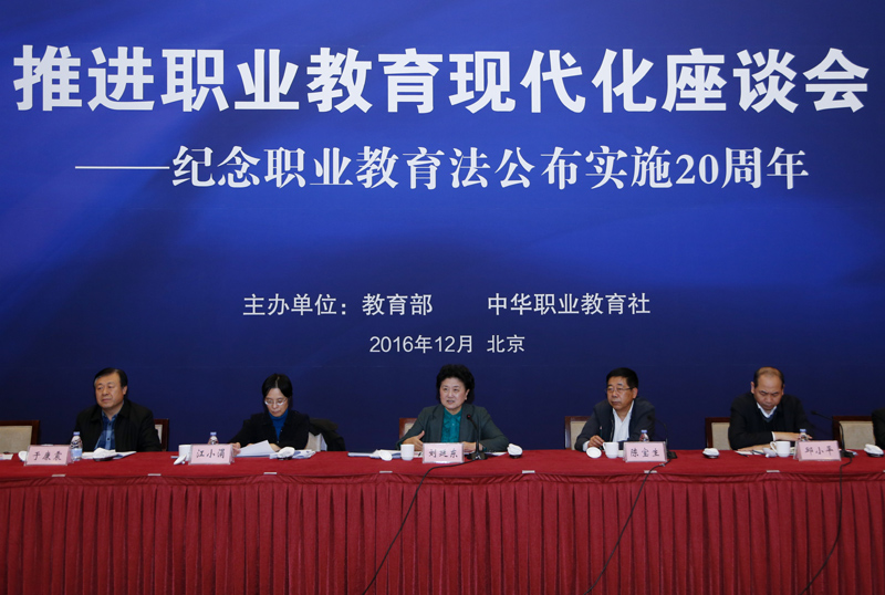 推進(jìn)職業(yè)教育現(xiàn)代化座談會(huì)12月2日在京召開(kāi)。中共中央政治局常委、國(guó)務(wù)院總理李克強(qiáng)作出重要批示。批示指出:加快發(fā)展現(xiàn)代職業(yè)教育,對(duì)于發(fā)揮我國(guó)人力和人才資源巨大優(yōu)勢(shì)、提升實(shí)體經(jīng)濟(jì)綜合競(jìng)爭(zhēng)力具有重要意義。在各方面共同努力下,近年來(lái)職業(yè)教育改革發(fā)展取得了顯著成就,應(yīng)予充分肯定。“十三五”時(shí)期,希望圍繞貫徹黨中央、國(guó)務(wù)院重大戰(zhàn)略部署,落實(shí)新發(fā)展理念,切實(shí)把職業(yè)教育擺在更加突出的位置,加快構(gòu)建現(xiàn)代職業(yè)教育體系。堅(jiān)持面向市場(chǎng)、服務(wù)發(fā)展、促進(jìn)就業(yè)的辦學(xué)方向,進(jìn)一步深化改革創(chuàng)新,強(qiáng)化產(chǎn)教融合、校企合作,積極鼓勵(lì)和支持社會(huì)力量參與,努力建成一批高水平的職業(yè)學(xué)校和骨干專(zhuān)業(yè),加快培育大批具有專(zhuān)業(yè)技能與工匠精神的高素質(zhì)勞動(dòng)者和人才,深度融入大眾創(chuàng)業(yè)、萬(wàn)眾創(chuàng)新和“中國(guó)制造2025”的實(shí)踐之中,促進(jìn)新動(dòng)能發(fā)展和產(chǎn)業(yè)升級(jí),帶動(dòng)擴(kuò)大就業(yè)和脫貧攻堅(jiān),為推動(dòng)經(jīng)濟(jì)保持中高速增長(zhǎng)、邁向中高端水平作出新貢獻(xiàn)。中共中央政治局委員、國(guó)務(wù)院副總理劉延?xùn)|出席會(huì)議并講話。她強(qiáng)調(diào),要深入貫徹黨中央、國(guó)務(wù)院決策部署,認(rèn)真落實(shí)李克強(qiáng)總理重要批示,加快推進(jìn)職業(yè)教育現(xiàn)代化,使職業(yè)教育在決勝全面小康進(jìn)程中發(fā)揮更加突出的作用。