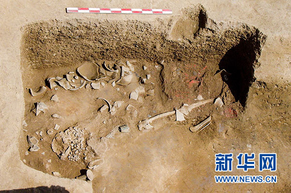 在河南偃師二里頭遺址發(fā)現(xiàn)的貴族墓葬(2002年4月13日攝)。 你知道“最早的中國”在哪里嗎?——河南偃師二里頭。洛河南岸一個普通的村莊,看似與中原大地上的千村萬落一樣平淡無奇,卻埋藏著中華民族的重大秘密:公元前1800年至前1500年間,這里曾有中國最早的“紫禁城”,上演過夏的繁華和夏商王朝更替的壯闊史劇。這里還擁有最早的城市主干道網(wǎng)、最早的青銅禮器群及最早的鑄銅作坊、最早的制作綠松石器的作坊、最早的雙輪車的車轍。二里頭遺址豐富的內(nèi)涵不斷給世人以驚喜,隨著“十三五”期間國家重大文化工程——二里頭遺址博物館的興建,眾多中國乃至東亞“之最”在這里浮出水面。新華社發(fā)
