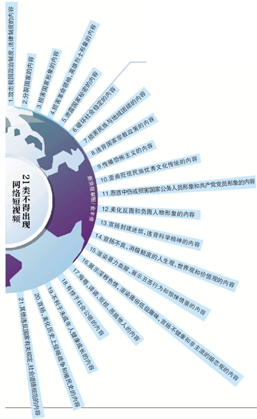 《規(guī)范》和《細(xì)則》針對(duì)網(wǎng)絡(luò)視聽領(lǐng)域存在的不足和薄弱環(huán)節(jié),分別對(duì)開展短視頻服務(wù)的網(wǎng)絡(luò)平臺(tái)以及網(wǎng)絡(luò)短視頻內(nèi)容審核的標(biāo)準(zhǔn)進(jìn)行規(guī)范!都(xì)則》明確了21類、100項(xiàng)內(nèi)容,“喪文化”“一夜情”“非主流婚戀觀”等都不得出現(xiàn)在短視頻中。