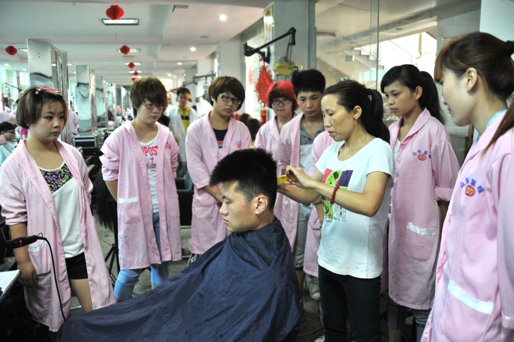 2014年6月23日,山東藍(lán)翔高級(jí)技工學(xué)校美容美發(fā)專業(yè)的學(xué)生在觀看老師的教學(xué)示范。