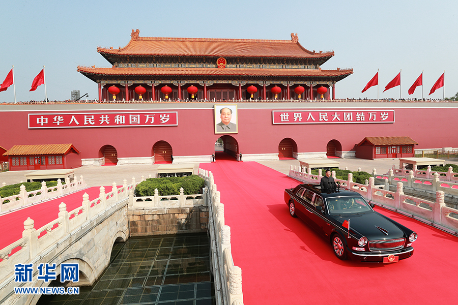10月1日,慶祝中華人民共和國(guó)成立70周年大會(huì)在北京天安門廣場(chǎng)隆重舉行。中共中央總書記、國(guó)家主席、中央軍委主席習(xí)近平發(fā)表重要講話并檢閱受閱部隊(duì)。這是習(xí)近平乘坐檢閱車,經(jīng)過(guò)金水橋,駛上長(zhǎng)安街。 新華社記者 龐興雷 攝