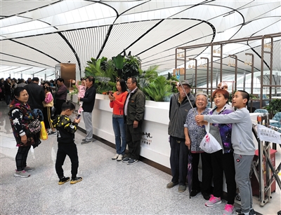 昨日清晨9時(shí)許,李春梅、張煥榮、趙錦華興沖沖走進(jìn)大興機(jī)場(chǎng)快軌站,這是她們第一次來(lái)這里乘坐快軌,也是第一次去大興機(jī)場(chǎng)。李春梅家住昌平,為了不耽誤和姐妹們的出行之約,她清晨7點(diǎn)多就從家里出發(fā),“只要有地鐵,感覺去大興也不遠(yuǎn),挺方便的!薄霸缇吐犝f(shuō)大興機(jī)場(chǎng)漂亮,我一時(shí)半會(huì)兒也沒(méi)法從這里坐飛機(jī),所以我們仨就約著先來(lái)大興機(jī)場(chǎng)參觀!壁w錦華告訴記者,“我們肯定會(huì)從這里乘飛機(jī)出行,今天看明白了,以后來(lái)就知道哪兒是哪兒啦。”