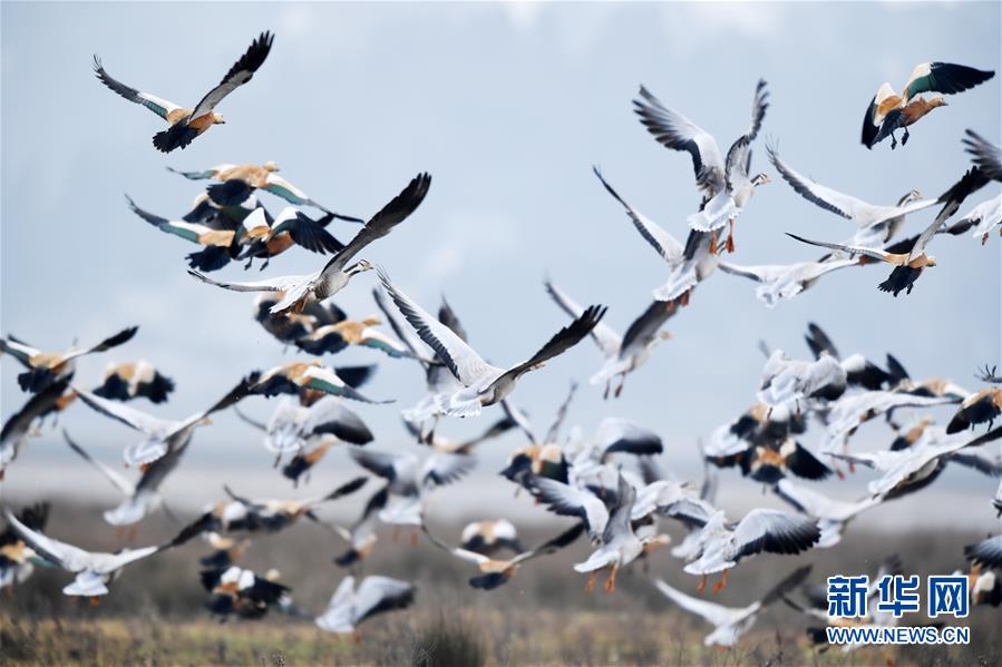 12月11日在貴州草海保護(hù)區(qū)拍攝的越冬的斑頭雁和赤麻鴨。 新華社記者 楊文斌 攝